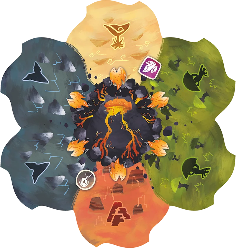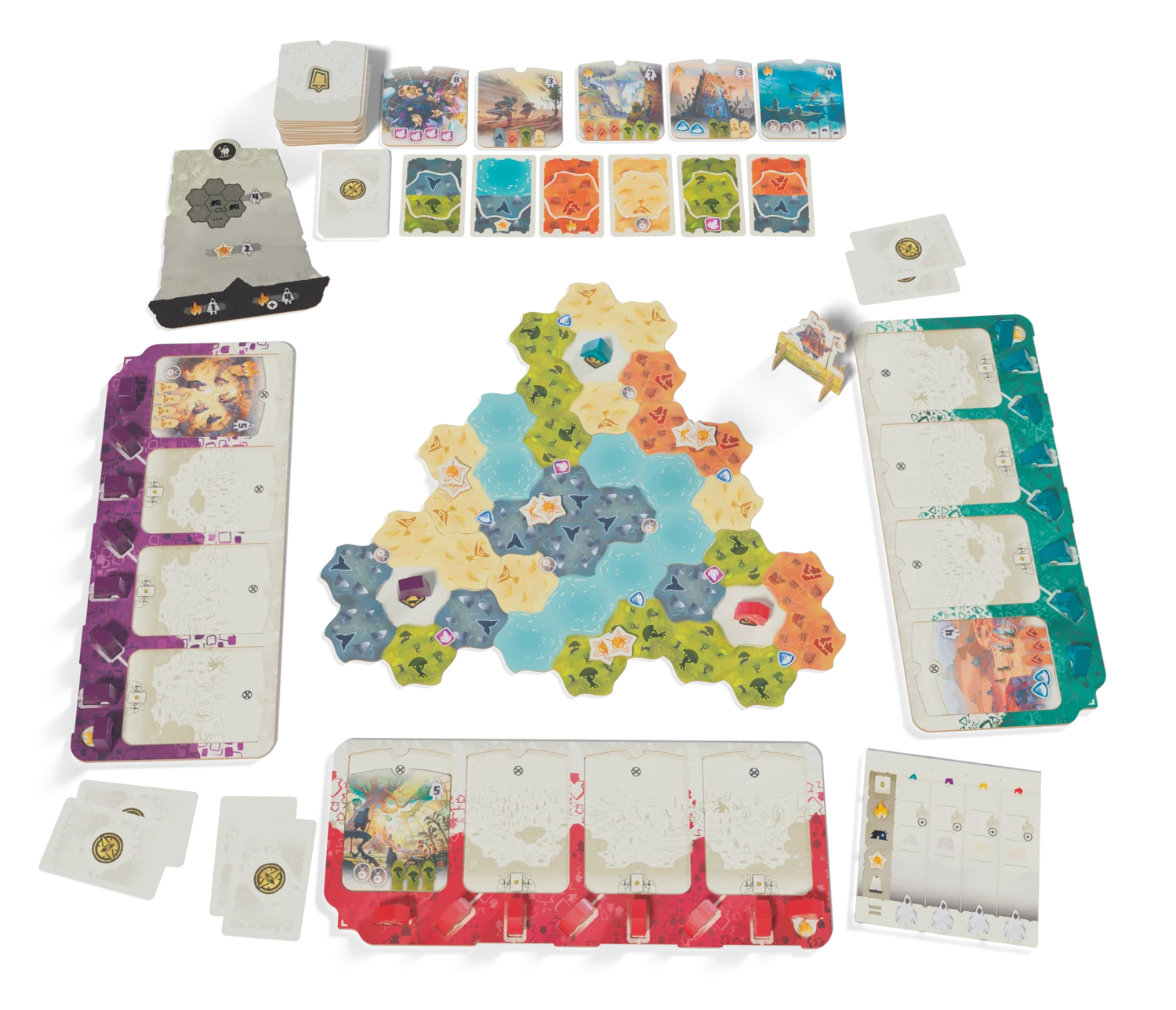 Dewan offers 4 distinct scenarios, each changing the board layout and the way victory points are scored, keeping the gameplay experience fresh. These scenarios introduce evolving events that progressively transform the board and force players to adapt their strategy throughout the game. Three thematic scenarios, including an erupting volcano, a downpour, and lake villages!