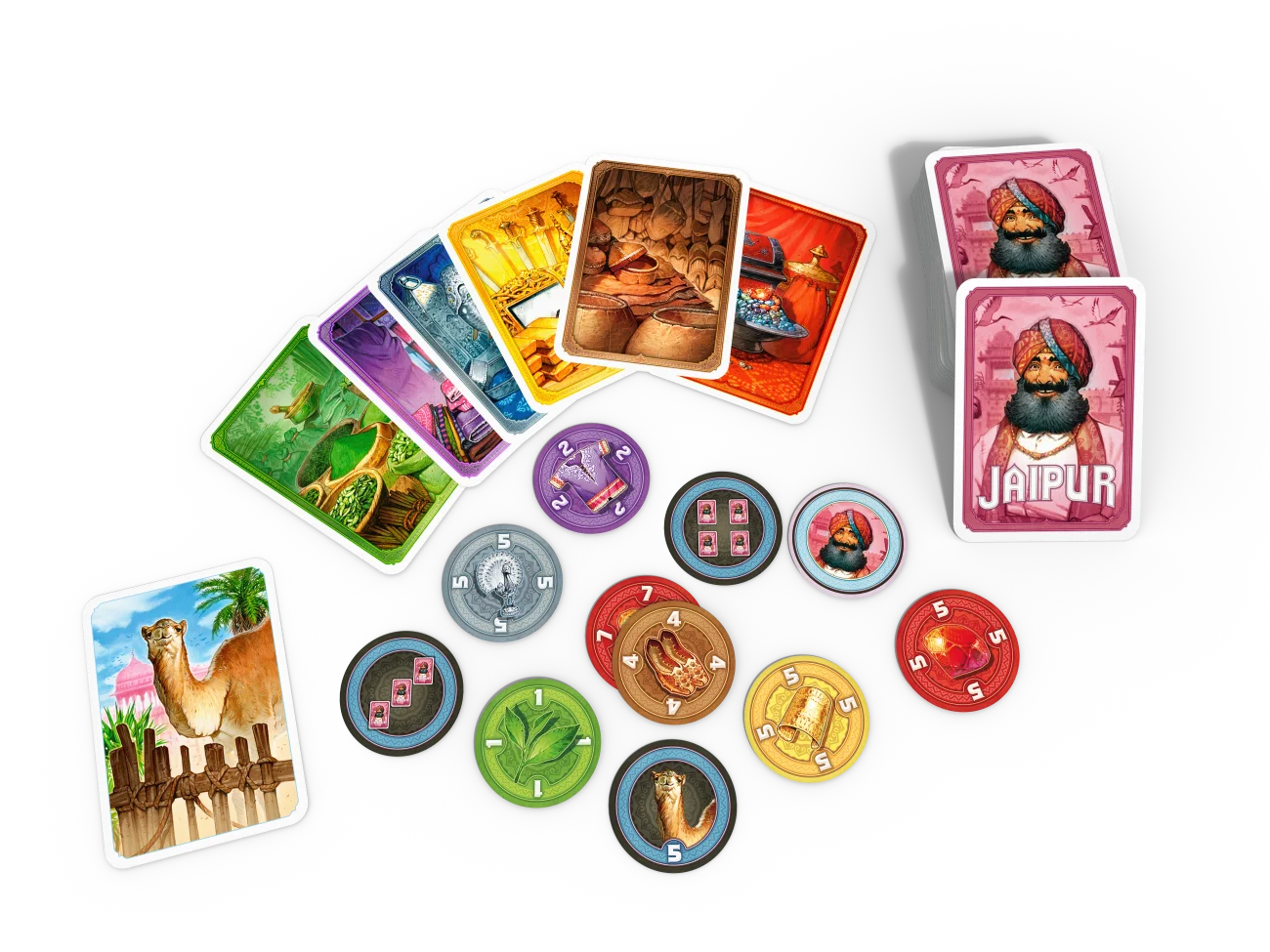 - 55 good cards (6 x diamonds, 6 x gold, 6 x silver, 8 x cloth, 8 x spice,10 x leather,11 x camel)