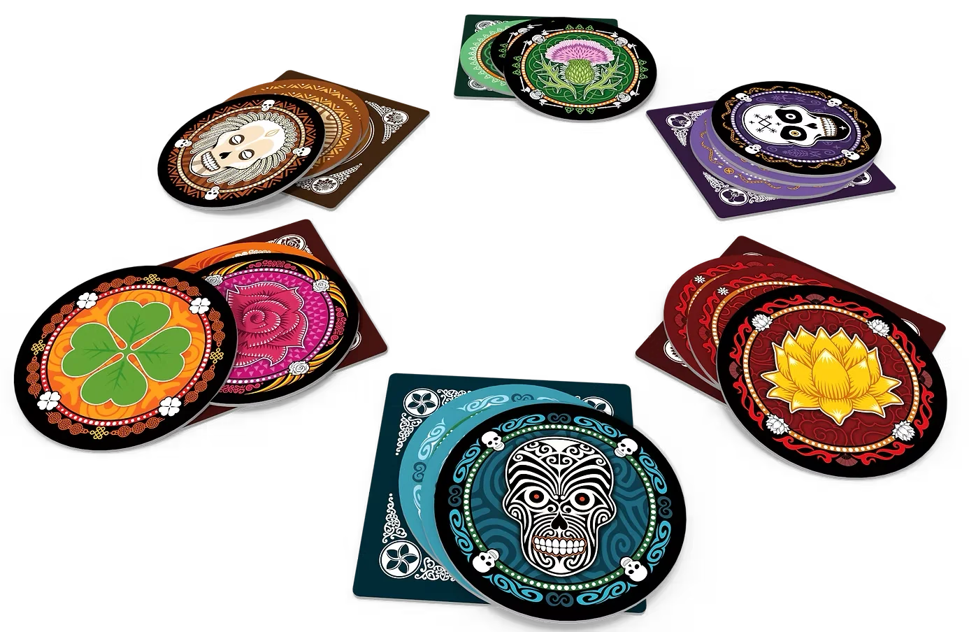 Each player has a set of 4 discs (3 flowers and 1 skull).  On each turn, the player must decide whether to place a disc face down on his mat or to launch a challenge by announcing the number of discs he thinks he can turn over among all the opponents… without falling on a skull!